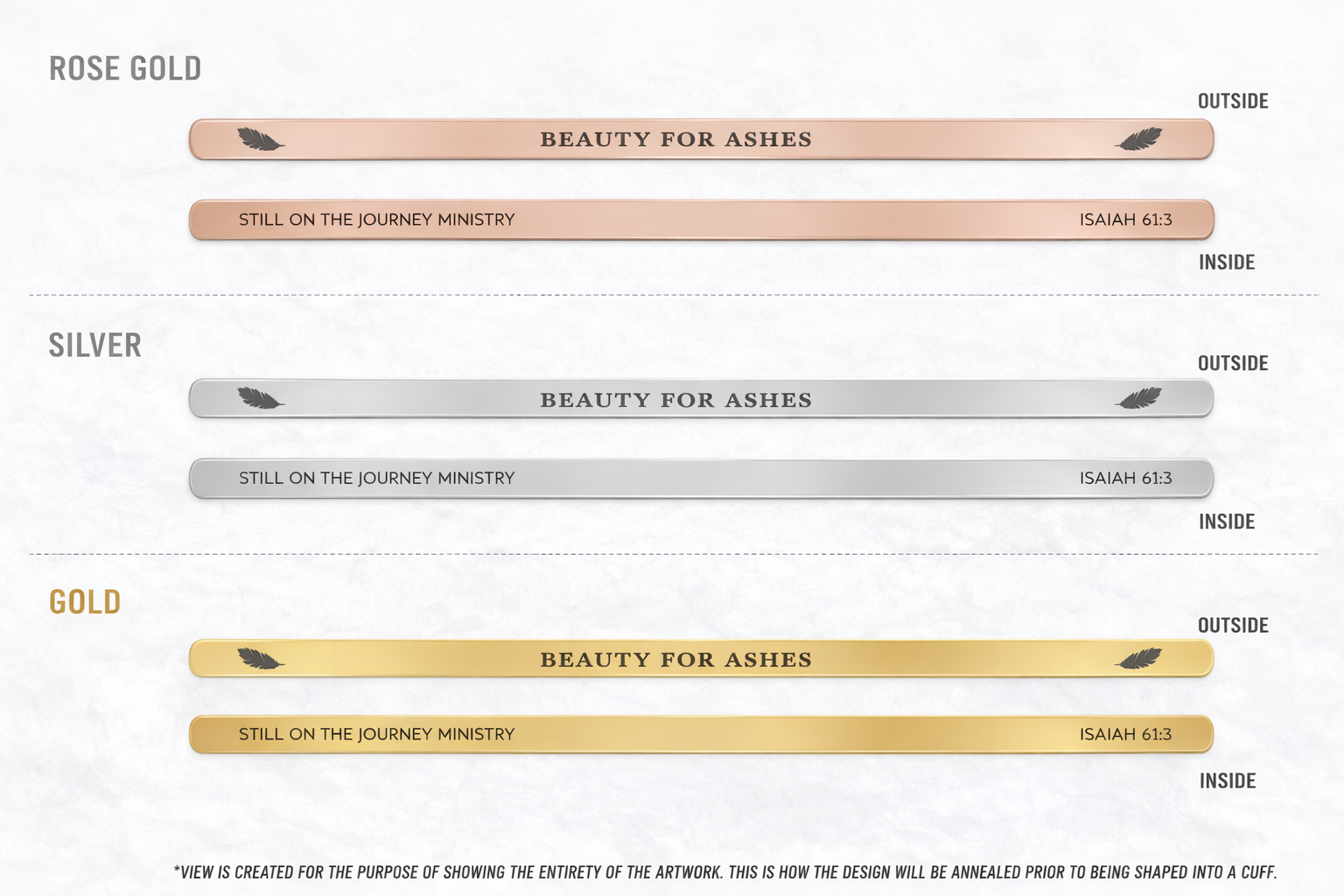 Affirmation cuff stamped with BEAUTY FOR ASHES. Delicate feather icons on each end. Inside reads: Still On The Journey Ministry • Isaiah 61:3. Available in Rose Gold or Silver. Free shipping included.