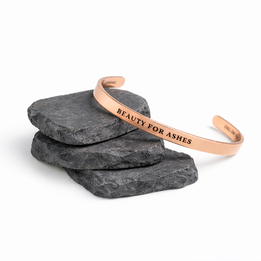 Wear your healing out loud. The Restoration Cuff is a daily reminder that what the fire touched, God has transformed. Stamped with the declaration BEAUTY FOR ASHES on the face and Still On The Journey Ministry • Isaiah 61:3 on the inside, this cuff is more than jewelry. It is a wearable testimony.